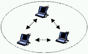 adhoc wlanTopologia określana tym mianem opiera się na tymczasowej (tak zakłada specyfikacja) sieci równorzędnej – podobnie jak „peer to peer”. Jest to tzw. niezależny zestaw usług podstawowych czyliIBSS.