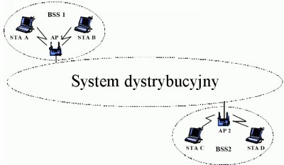 dystrybucja_wlanStandard 802.11b skupia się na przenośnych lub ruchomych urządzeniach bezprzewodowych. Dlatego też zakłada się możliwość przemieszczania klientów zarówno wewnątrz jak i pomiędzy wieloma komórkami BSS (ang. roaming); połączonymi przez pewien system dystrybucyjny; bez utraty połączeń TCP/IP. Opisana wcześniej „możliwość przemieszczania się” stała się jedną z najbardziej rozpoznawalnych cech technologii bezprzewodowych - obsługa urządzeń mobilnych czyli znajdujących się w ruchu. Dzięki odpowiednim założeniom, które twórcy standardu przyjęli oraz wzajemnej komunikacji pomiędzy punktami dostępu z pomocą protokołu IAPP – mamy teraz możliwość nieskrępowanej niczym (czytaj: zwojami przewodów) pracy w środowisku sieciowym.