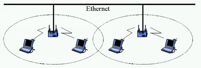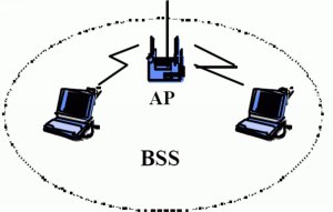 infrastructure wlanJest to główna topologia sieci bezprzewodowych. Opiera się mostach bezprzewodowych nazywanych punktami dostępu (ang. access point). Punkt dostępu wraz ze swoimi klientami bezprzewodowymi tworzy zestaw usług podstawowych czyliBSS.