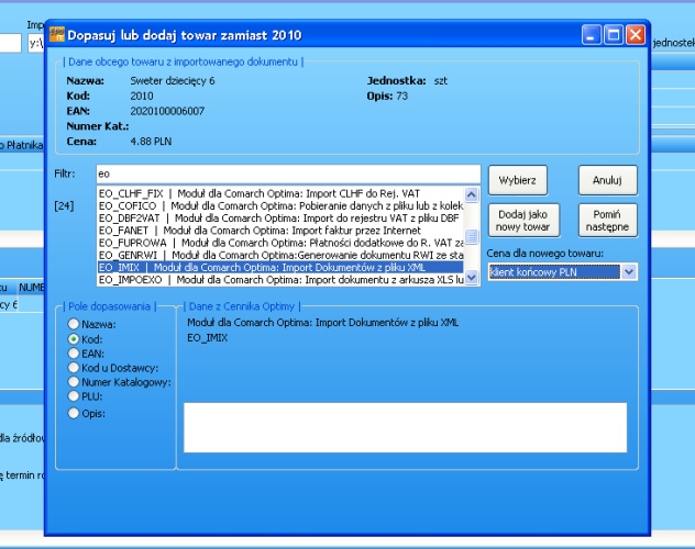 Moduł EO:imix to doskonałe narzędzie do ręcznego lub automatycznego importu plików XML pochodzących np. z wymiany pomiędzy użytkownikami Optimy. W ten sposób wystawca faktury sprzedaży może wysłać plik XML do nabywcy a ten szybko i sprawnie importuje go u siebie jako fakturę zakupu. W celu ułatwienia wymiany następuje odpowiednia identyfikacja kontrahenta oraz dopasowanie towarów, które znajdują się w bazie docelowej. W przypadku braku towarów - można je szybko dodać - ustawiając im m.in. odpowiednią cenę zakupu.